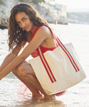 Contains 100% OCS-certified organic cotton, certified by Control Union CU811033. Premium, heavyweight fabric. Soft cotton, striped webbing handles. Can be carried by hand or over the shoulder.