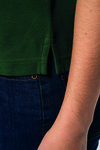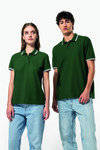 100% cotton. Heathered colors: 92% cotton / 8% viscose. Combed cotton. Piqué knit. Straight cut. Two-button placket in matching colors. Neck tape in main fabric. Side vents with main fabric binding. Ribbed trim with contrasting piping at the collar and cuffs. Double-needle hem.