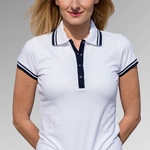 A best selling ladies polo with fitted cut and contrasting detials. Combed cotton and elastage blend.